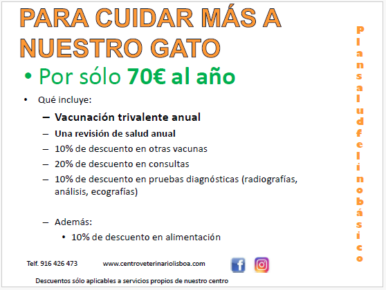 Le presentamos un plan económico anual para que pueda ofrecer a su gato los cuidados que usted quiere darle. Nuestros gatos necesitan más atención médica que sólo una vacunación anual. En este Plan Básico incluimos sin cargo la vacuna anual trivalente para protegerle de las infecciones víricas más habituales y una revisión de salud completa recomendada por el Colegio de Veterinarios de Madrid.