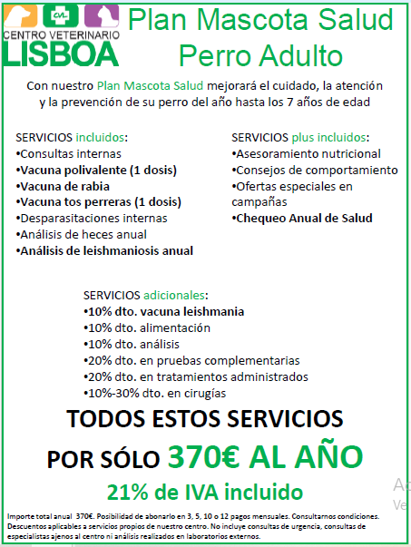 En esta etapa de su vida siguen necesitando cuidados preventivos y de salud. Con este plan le protegeremos con las vacunas anuales, las desparasitaciones internas y le ofreceremos una vigilancia de otras enfermedades, como es el caso de la leishmaniosis.